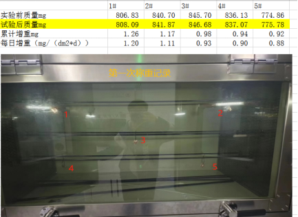 2023年浙江******產品檢驗有限公司第二次采購我司一臺型號為“WHQ-900B”型的混合氣體腐蝕試驗箱,設備在出廠之前,工作人員已經在我內部的實驗室進行過一次合格的銅片增重測試,之后設備被運送到客戶指定的場地安裝調試運行。客戶在設備運行了一個階段后,自行進行一次銅片增重試驗,試驗結束之后客戶將數(shù)據(jù)發(fā)給我司,以下是客戶和我的聊天記錄和客戶第一次做的數(shù)據(jù):