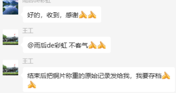為了更好地說明銅片試驗(yàn)的重要性,下面分享一個(gè)檢測(cè)公司的銅片試驗(yàn)實(shí)際案例:2024年8月份合肥******檢測(cè)技術(shù)有限公司第一次采購(gòu)我司一臺(tái)型號(hào)為“WHQ-300B”型的混合氣體腐蝕試驗(yàn)箱,設(shè)備被運(yùn)送到客戶指定的場(chǎng)地安裝調(diào)試運(yùn)行。安裝調(diào)試后,客戶后期自行進(jìn)行一次銅片增重試驗(yàn),我司技術(shù)人員進(jìn)行線上指導(dǎo)操作,試驗(yàn)結(jié)束之后客戶將數(shù)據(jù)發(fā)給我司,以下是客戶和我司聊天記錄以及客戶做的數(shù)據(jù)信息: